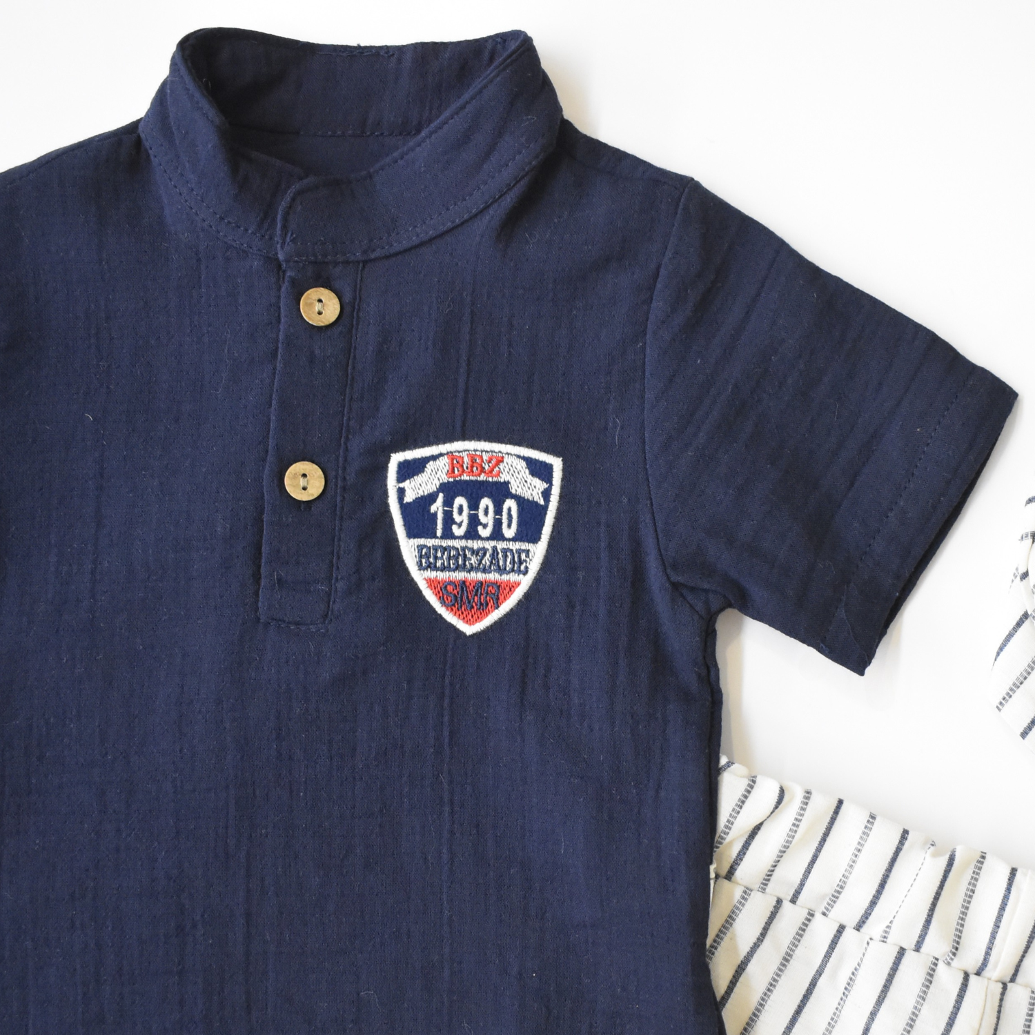 Keep your little guy stylish and comfy with this classic two-piece set! Made from 100% soft, breathable cotton, this set includes a chinese colar shirt, striped shorts, and matching beret for a playful, coordinated look. Perfect for casual days or family outings, this outfit offers a perfect balance of comfort and style for your baby boy.