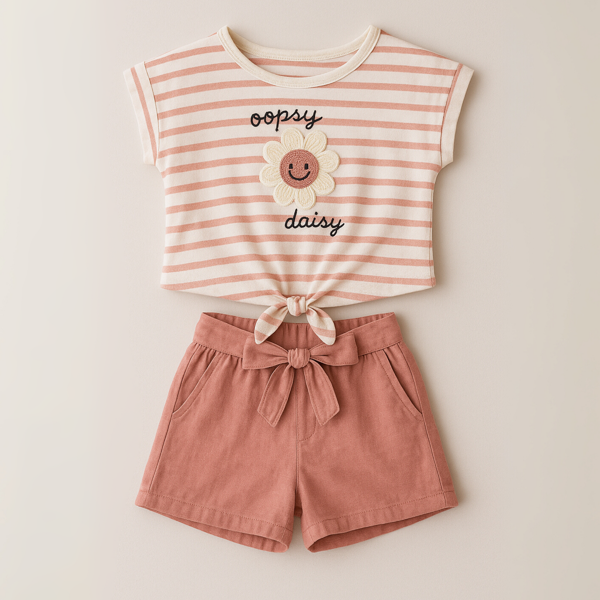 Upgrade her summer wardrobe with this adorable T-shirt and shorts set! Made from 100% soft cotton, breathable fabric, this set ensures all-day comfort for playtime, outings, or lounging at home. The stylish T-shirt features a fun graphic design, while the matching shorts come with an elastic waistband for a perfect fit. Lightweight and easy to mix and match, this set is a must-have for warm-weather adventures.