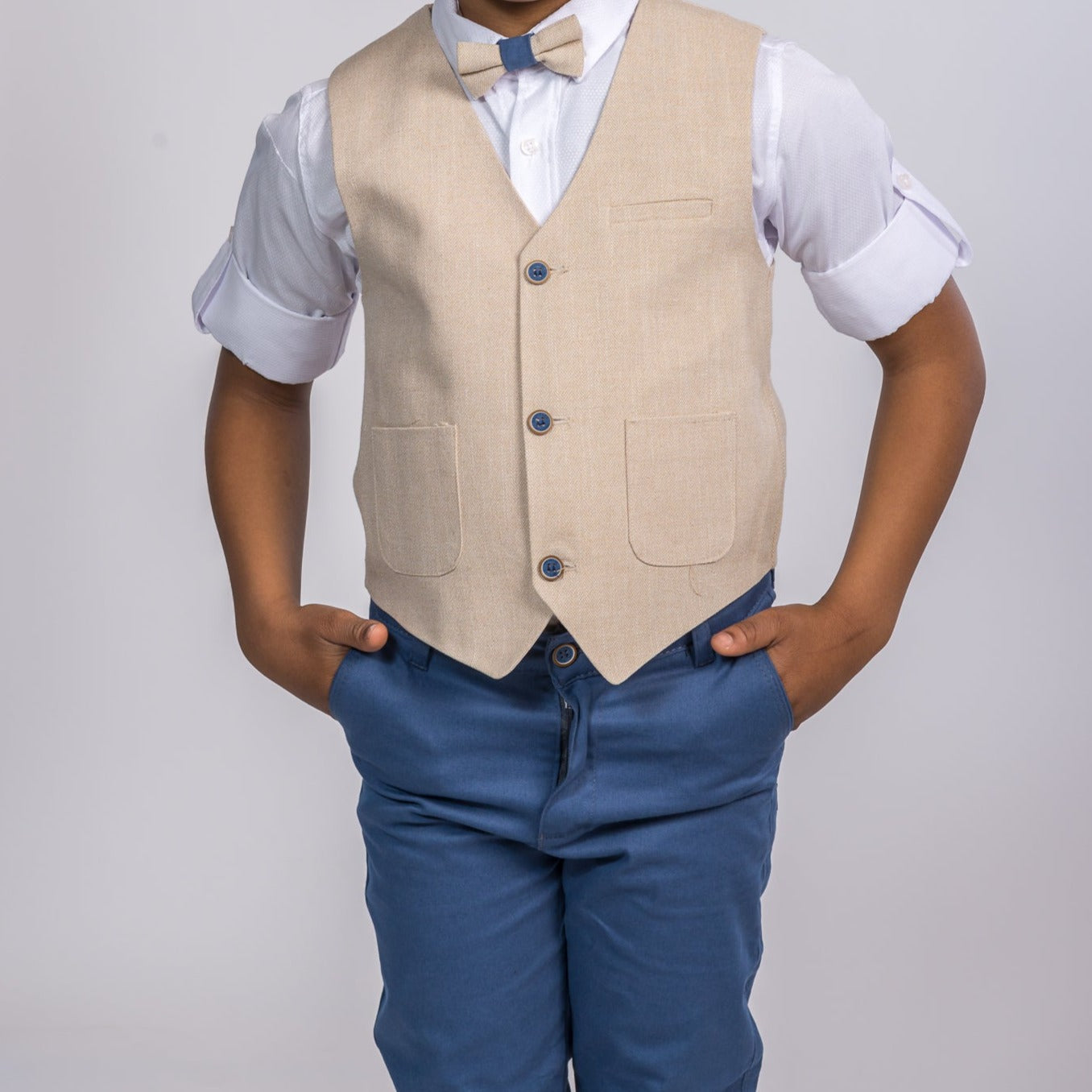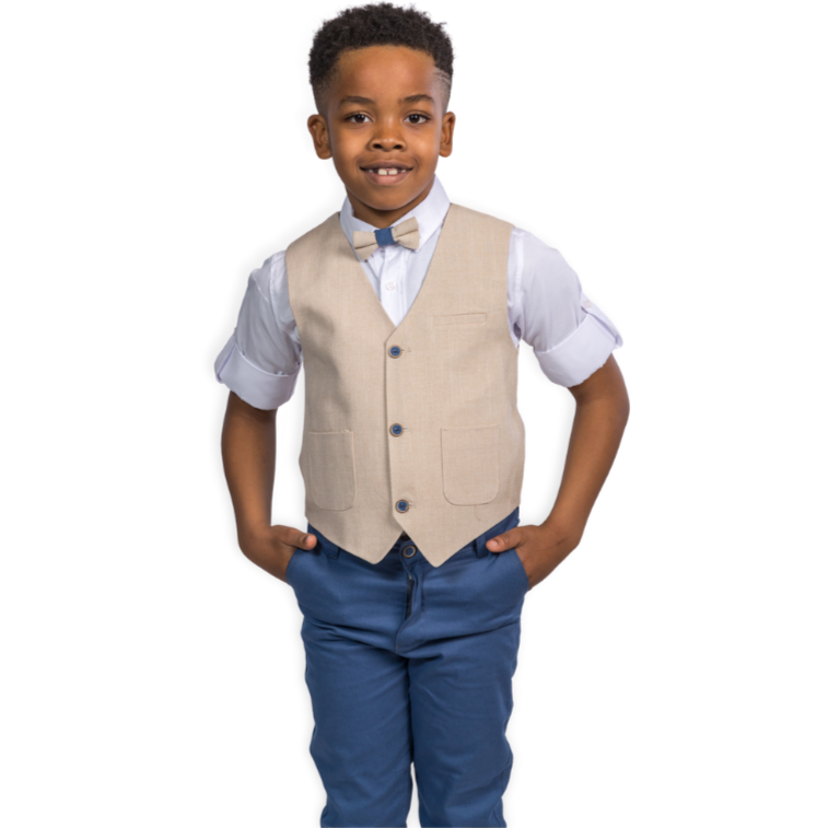 This is taking the vest set style to a new level. Stylish knit cotton vest set including sleeveless vest, patterned cotton shirt, and slim fit adjustable waist knit cotton pants, and matching bowtie. A real superstar in the making!