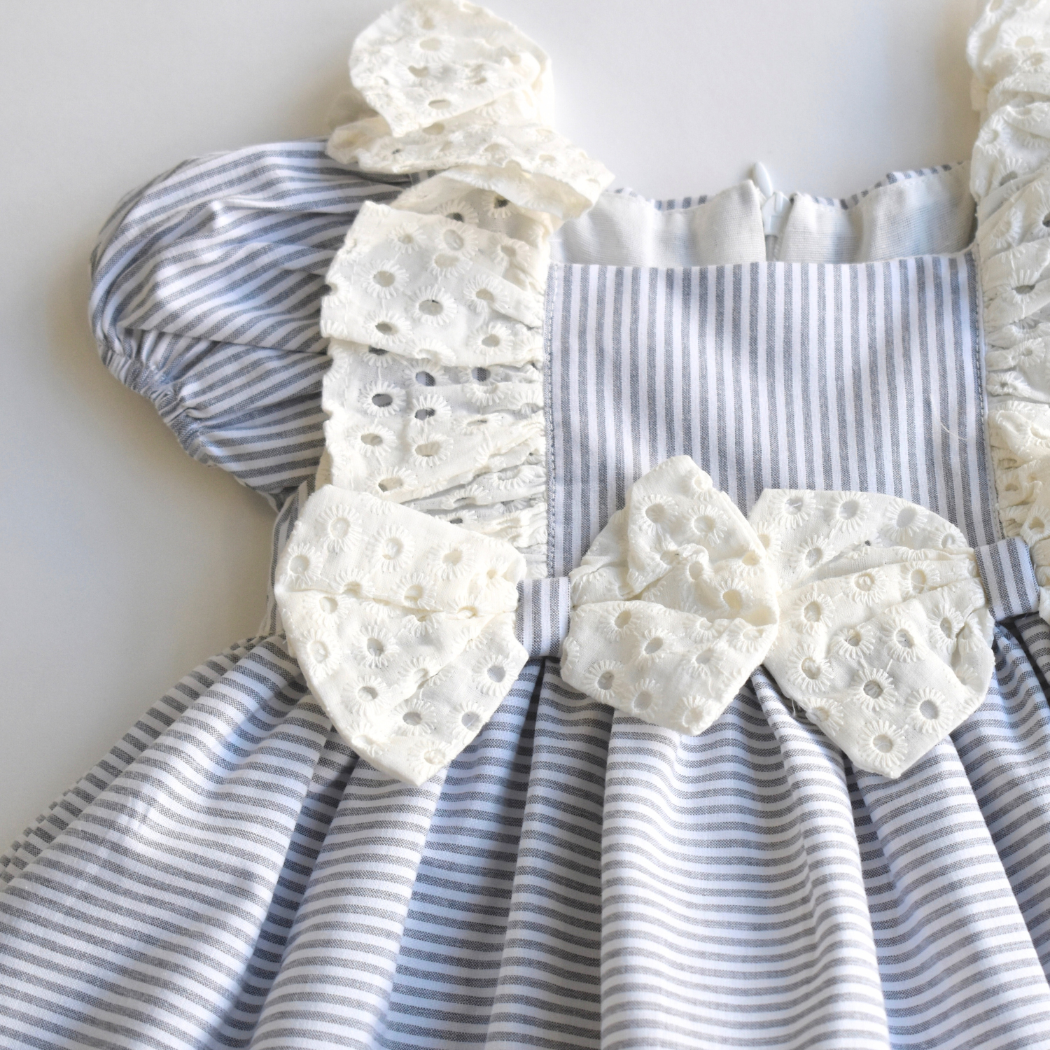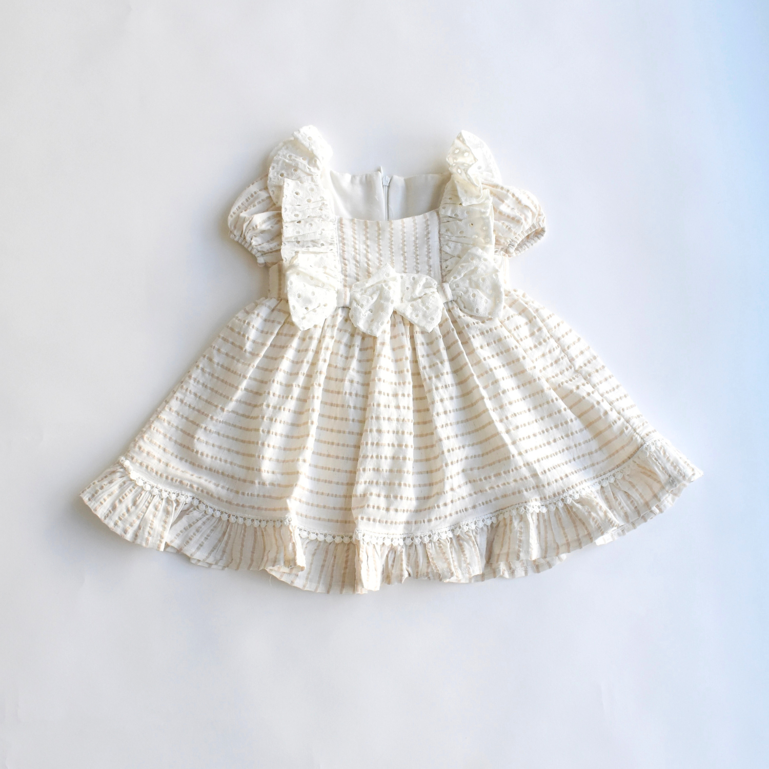 Upgrade your wardrobe with this adorable cotton dress! Embrace the elegant frilly lace, charming stripes, and cute bow detail on the front. Perfect for any occasion, this dress exudes effortless style and sophistication.